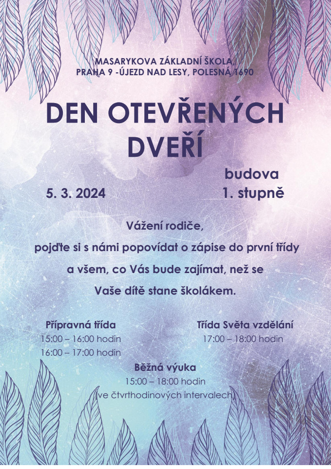 Masarykova základní škola, Praha 9 - Újezd nad Lesy bude mít dne 5.3.2024 den otevřených dveří pro rodiče budoucích prvňáčků. Více informací viz přiložený leták.