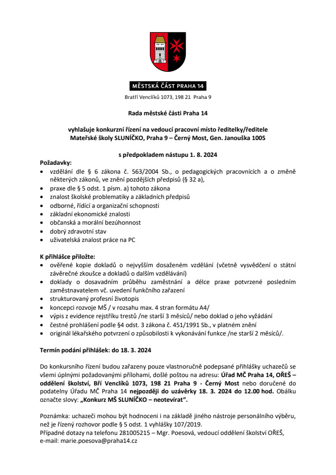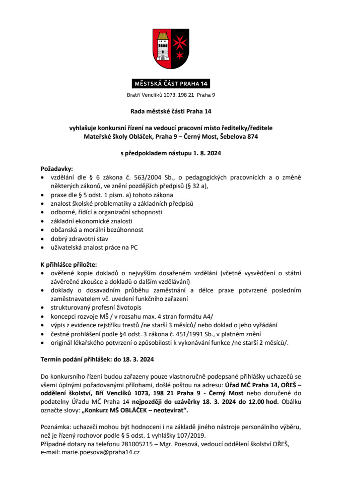 Městská část Praha 14 vyhlašuje 2 konkursních řízení na pozici ředitele/ředitelky do mateřských škol. Více informací v přiložených dokumentech.