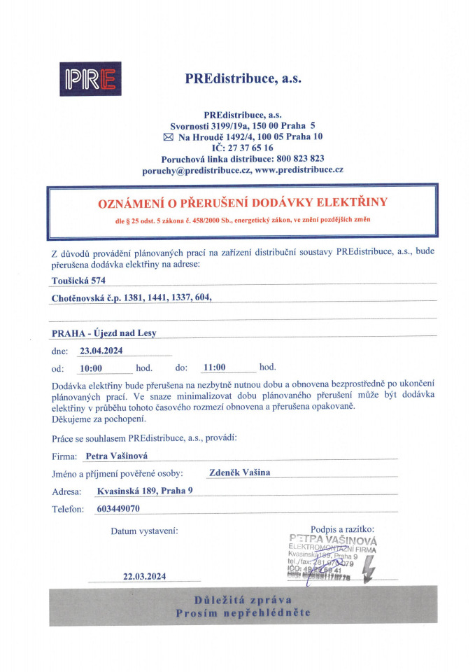 Oznámení o přerušení dodávky elektřiny - Toušická, Chotěnovská 23.4.2024
