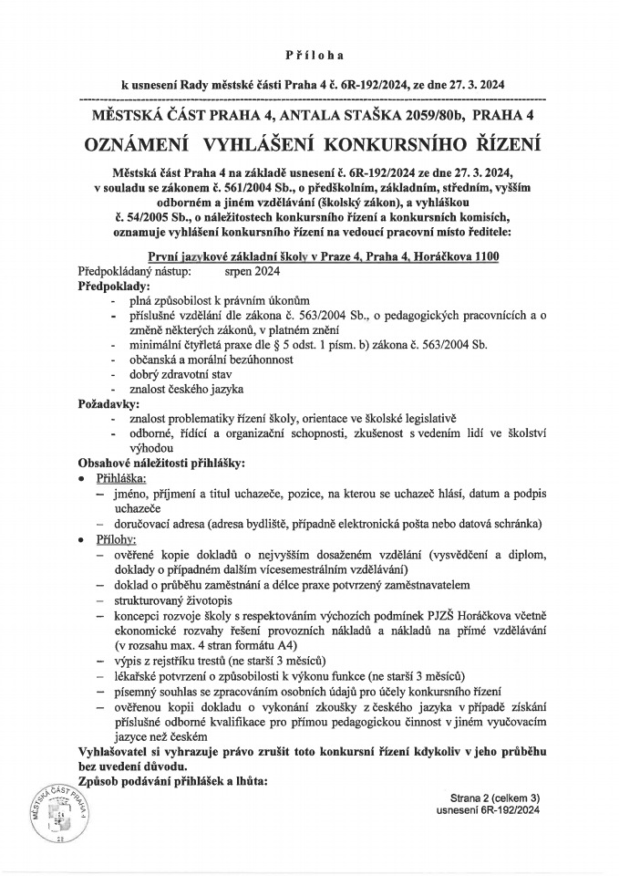 MČ Praha 4 vyhlašuje konkursní řízení na ředitele/ředitelku PJZŠ Horáčkova.