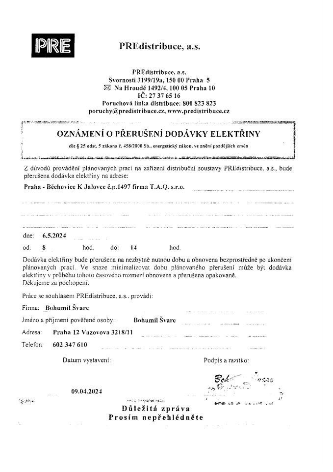 Oznámení o přerušení dodávky elektřiny - K Jalovce 1497, Běchovice