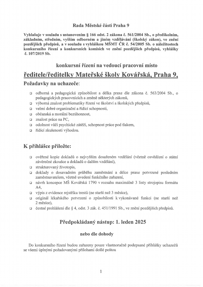 • Vyhlášení konkurzu MŠ Kovářská II.
