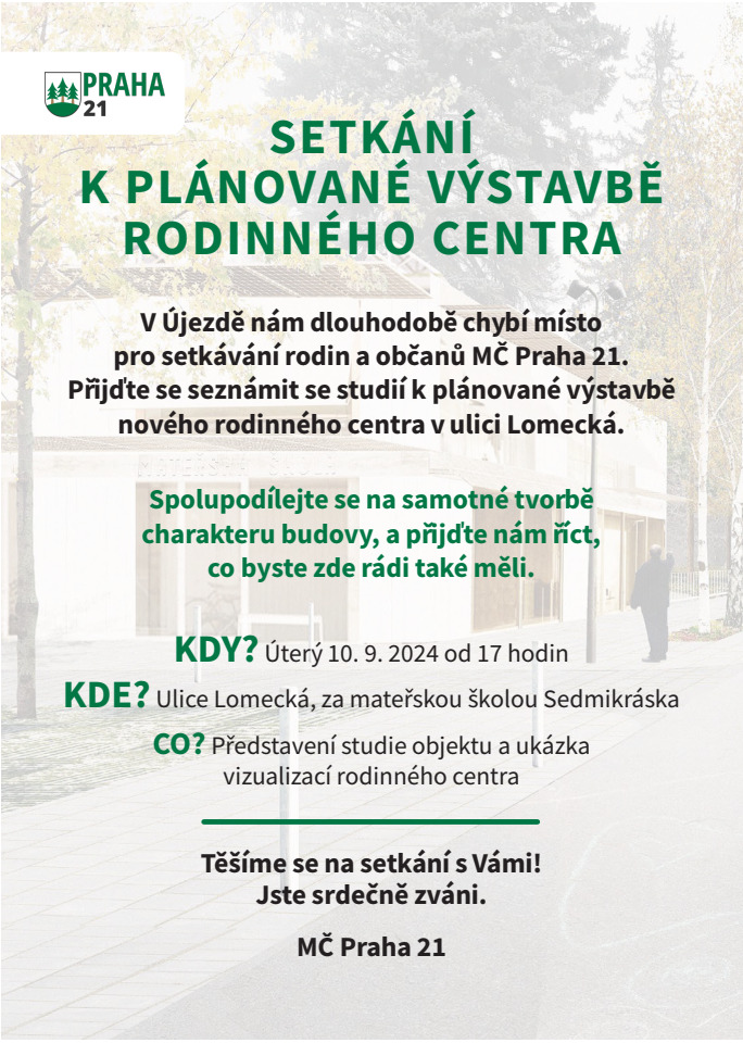 V naší městské části Praha 21 dlouhodobě chybí prostor pro setkávání rodin a občanů. Přijďte se seznámit s projektem plánované výstavby nového rodinného centra v ulici Lomecká, který by měl tuto potřebu naplnit.