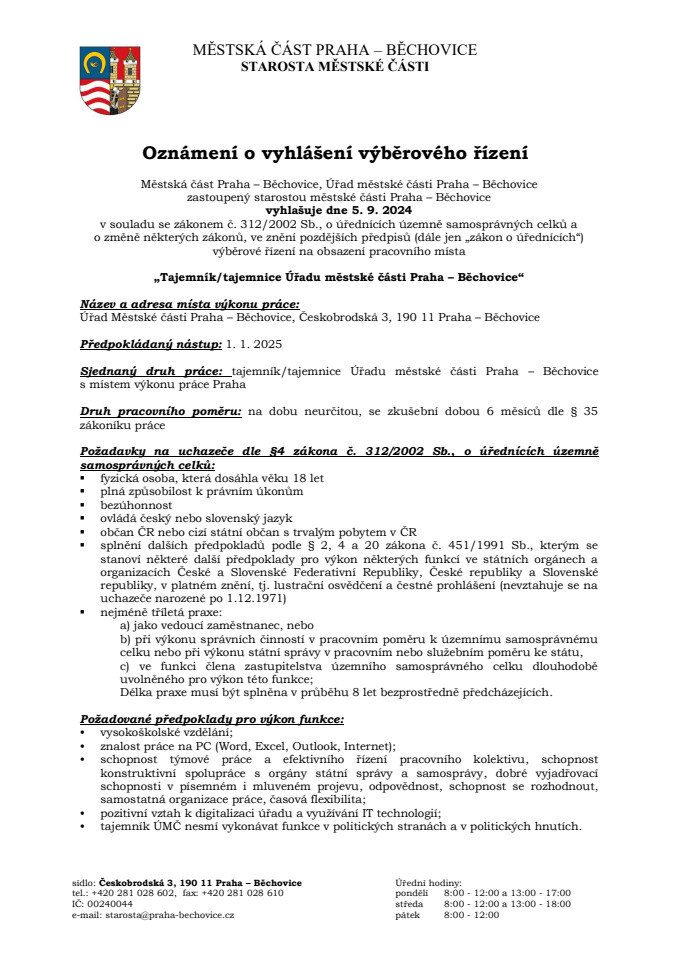 „Tajemník/tajemnice Úřadu městské části Praha - Běchovice“