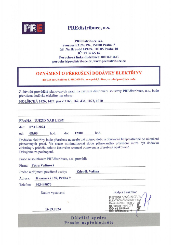 Oznámení o přerušení dodávky elektřiny