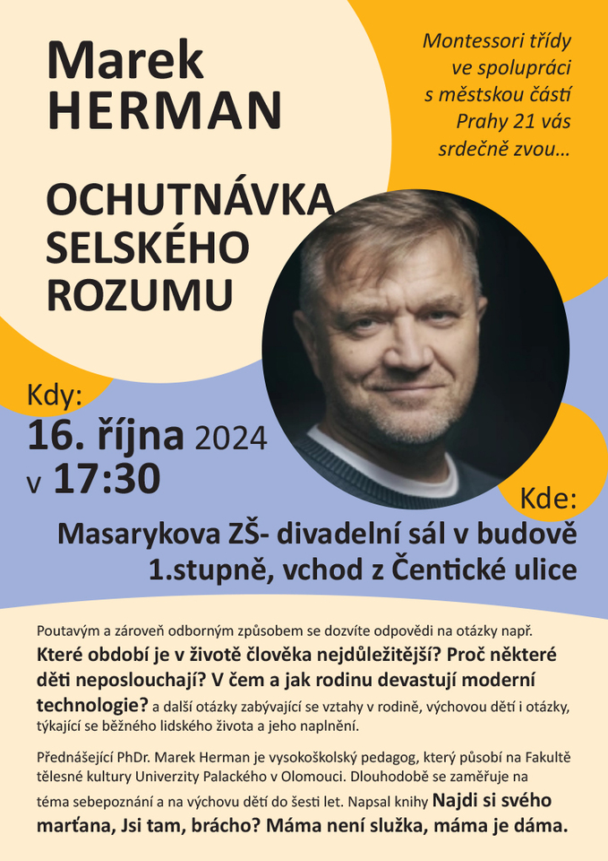 Přijměte pozvání na přednášku PhDr. Marka Hermana, vysokoškolského pedagoga, který působí na Fakultě tělesné kultury Univerzity Palackého v Olomouci. Přednáška se bude konat 16.10.2024 od 17:30 v divadelním sále budovy 1. stupně Masarykovy ZŠ v parku, vchod z Čentické.