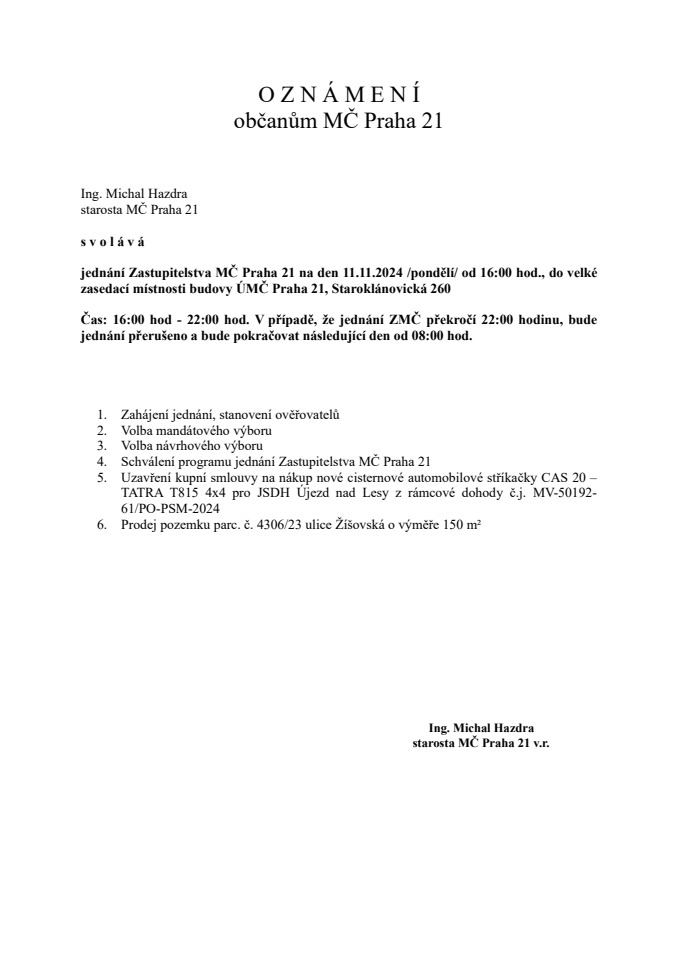 jednání Zastupitelstva MČ Praha 21 na den 11.11.2024 /pondělí/ od 16:00 hod., do velké zasedací místnosti budovy ÚMČ Praha 21, Staroklánovická 260.