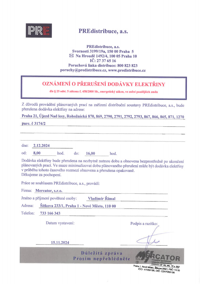 Oznámení o přerušen dodávky elektřiny 2.12.2024