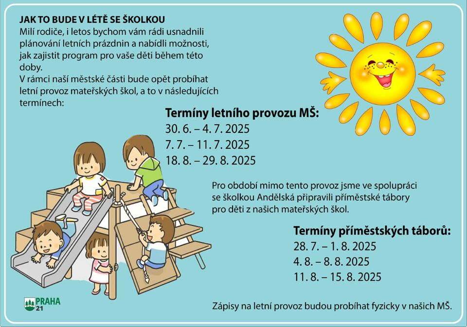 i letos bychom vám rádi usnadnili plánování letních prázdnin a nabídli možnosti, jak zajistit program pro vaše děti během této doby. V rámci naší městské části bude opět probíhat letní provoz mateřských škol, a to v následujících termínech: