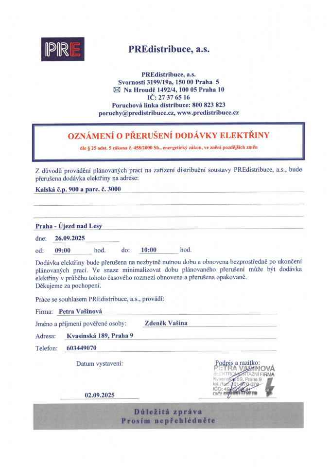 Oznámení o přerušení dodávky elektřiny 26.9.2025