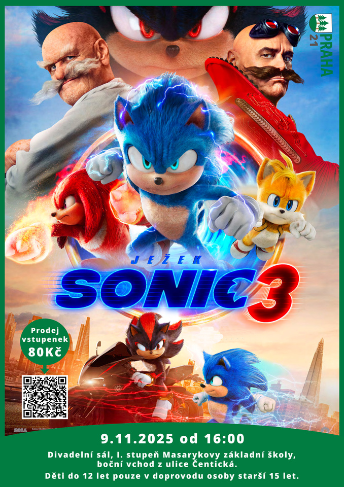 Dne 9.11. 2025 od 16:00 Vás zveme na filmový zážitek pro celou rodinu - "Sonic 3"! Film se bude promítat v divadelním sále 1. stupně MZŠ.