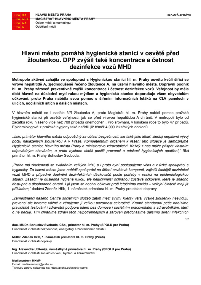 Na území hlavního města se nadále šíří virová hepatitida A. Magistrát hl. m. Prahy ve spolupráci s Hygienickou stanicí posiluje osvětu veřejnosti a Dopravní podnik zároveň zvýšil četnost i koncentraci dezinfekce vozů MHD. Odborníci doporučují především důkladné mytí rukou a očkování, které je nejúčinnější ochranou před tímto onemocněním.