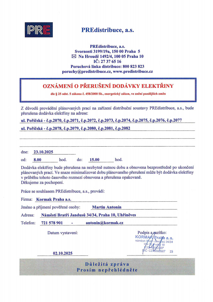 Oznámení o přerušení dodávky elektřiny