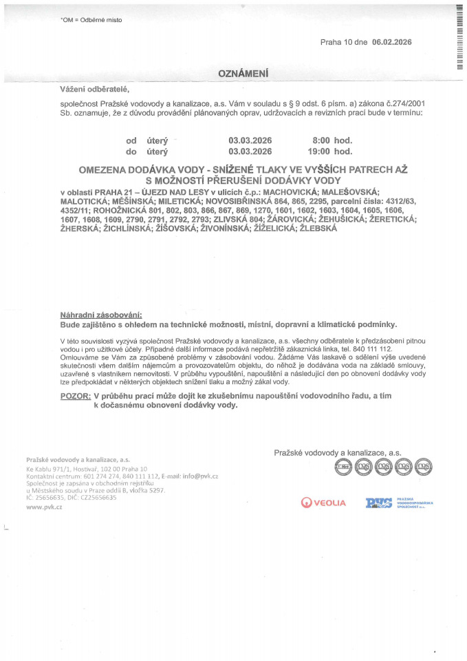 AktualitaOznámení o omezení dodávky vodyNaposledy upraveno: 10. únor 2026oznámení.pdfPoslední změna: 10. 2. 2026, 13:47:25, velikost: 363.72 KB Stáhnout Číst Náhled Osoba odpovědná za aktuálnost informací: Hnízdil Luboš StavPublished