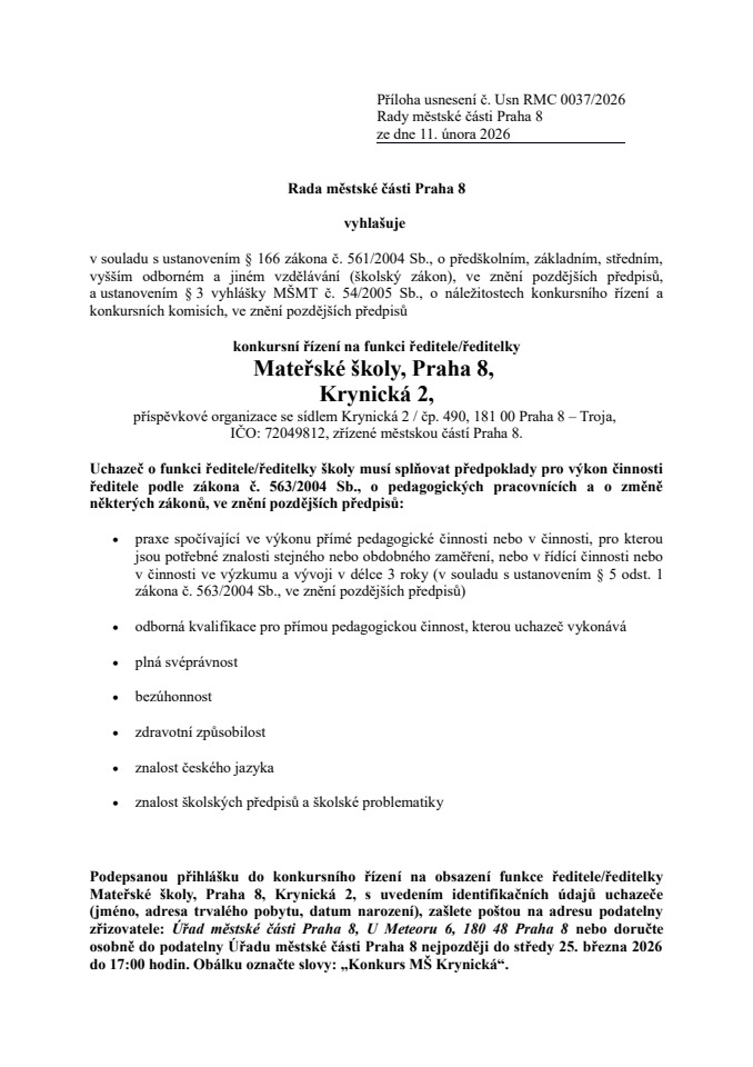 Rada městské části Praha 8 vyhlašuje konkursní řízení na funkci ředitele/ředitelky Mateřské školy, Praha 8, Krynická 2