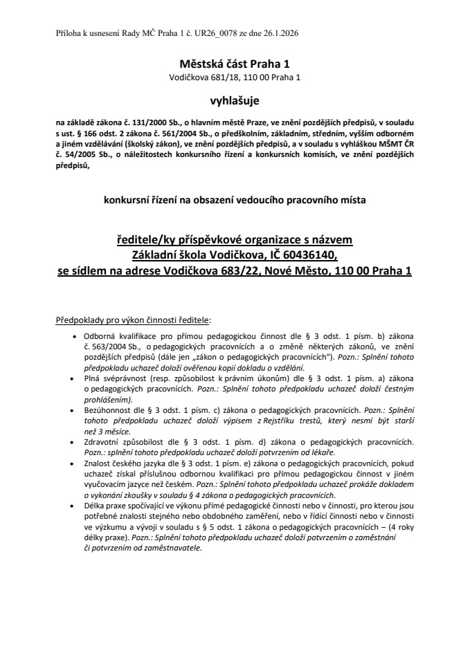 Městská část Praha 1 vyhlašuje konkursní řízení na obsazení vedoucího pracovního místa ředitele/ky příspěvkové organizace s názvem Základní škola Vodičkova