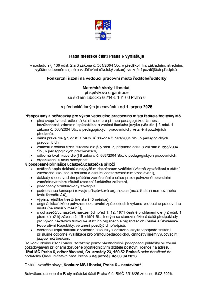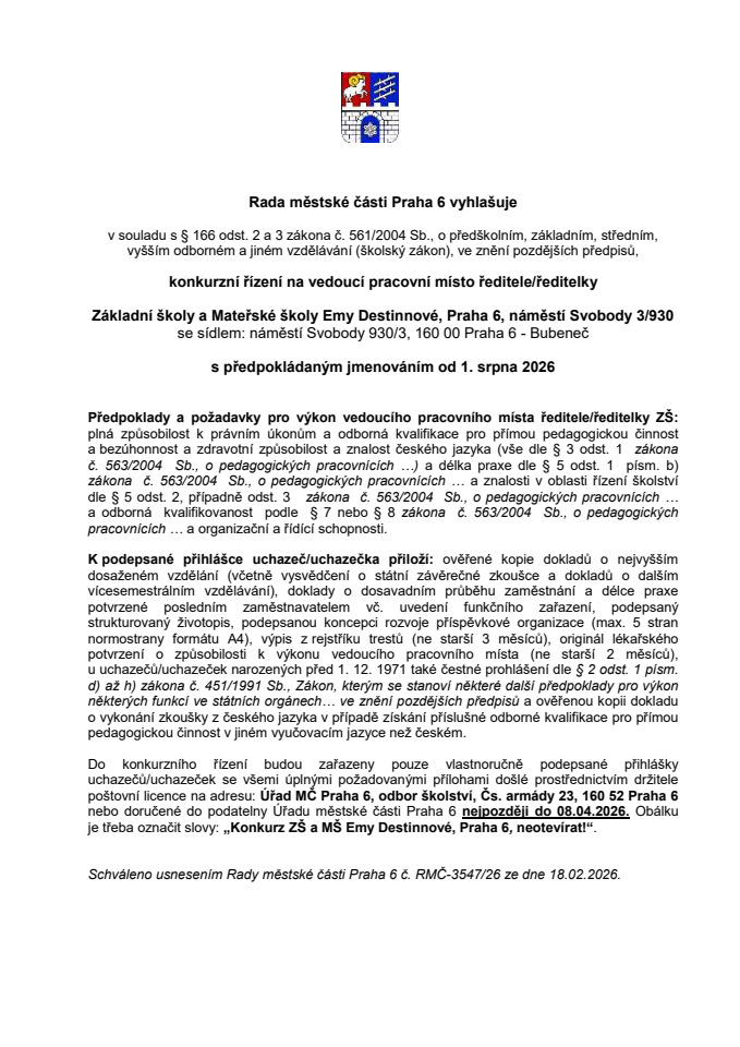 Rada městské části Praha 6 vyhlašuje konkurzní řízení