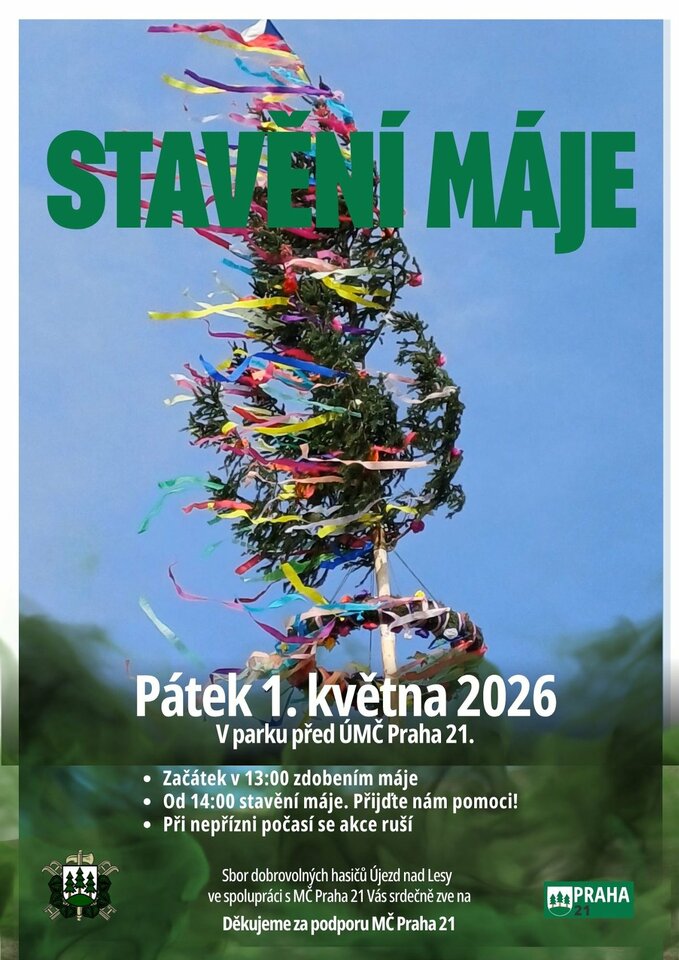 Sbor dobrovolných hasičů Praha – Újezd nad Lesy zve ve spolupráci s Městskou částí Praha 21 všechny obyvatele i návštěvníky na tradiční jarní akci Stavění máje, která se koná v pátek 1. května 2026.