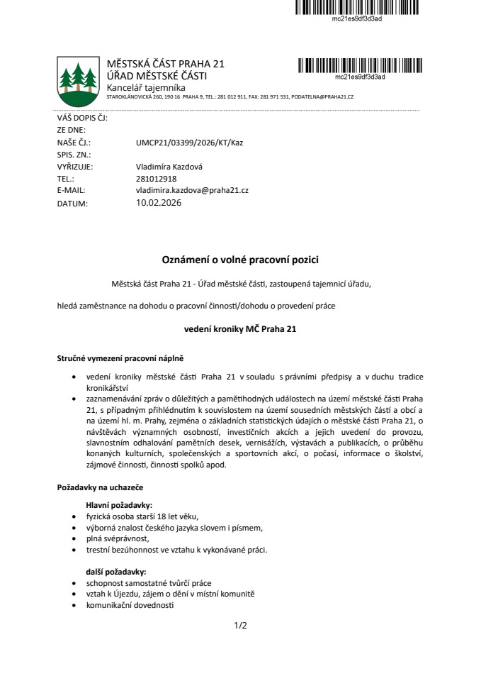 Oznámení o volné pracovní pozici vedení kroniky MČ Praha 21.