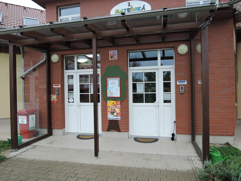 Do areálu MŠ se vstupuje jednokřídlou brankou (šířka 119 cm), která se otevírá mechanicky směrem do zahrady. K budově vede chodníček se zámkovou dlažbou ve sklonu (7 %). Budovu tvoří hlavní středová část s dvěma přiléhajícími trakty. Prostor před objektem má kvalitní povrch ze zámkové dlažby. Dva rovnocenné vstupy ve středové části jsou řešeny zrcadlově. Dveře jsou dvoukřídlé (hlavní křídlo šířka 91 cm, vedlejší křídlo šířka 45 cm) a otevírají se mechanicky směrem dovnitř. Zvonková signalizace (výška 150 cm) je umístěna u obou dveří.