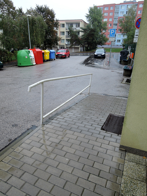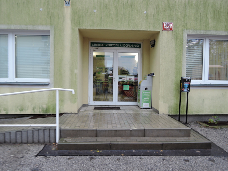 Prostor před objektem má kvalitní asfaltový povrch. Pro kompenzaci +2 schodů je před vstupem k dispozici přímá jednoramenná rampa (sklon 12,5 %, šířka 138 cm, délka 289 cm). Rampa má drsný povrch ze zámkové dlažby a jednostranné madlo (výška 82 cm). Manipulační prostor nad rampou je dostatečný. Vstupní dveře objektu jsou dvoukřídlé (hlavní křídlo šířka 88 cm, vedlejší křídlo šířka 94 cm) a otevírají se mechanicky směrem ven. Zvonková signalizace u dveří chybí.