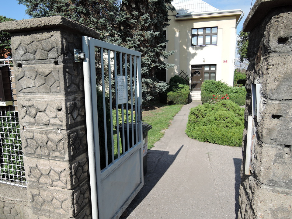 Ordinace se nachází v přední části vilového domu. Přístupová komunikace má asfaltový povrch s nerovnostmi a spárami. Do zahrady vede jednokřídlá branka (šířka 118 cm) z ulice. Zvonková signalizace (výška 136 cm) je umístěna vpravo u branky. Před vstupem je krátké schodiště (+4 schody). Jednokřídlé vstupní dveře (šířka 90 cm) se otevírají mechanicky směrem dovnitř.