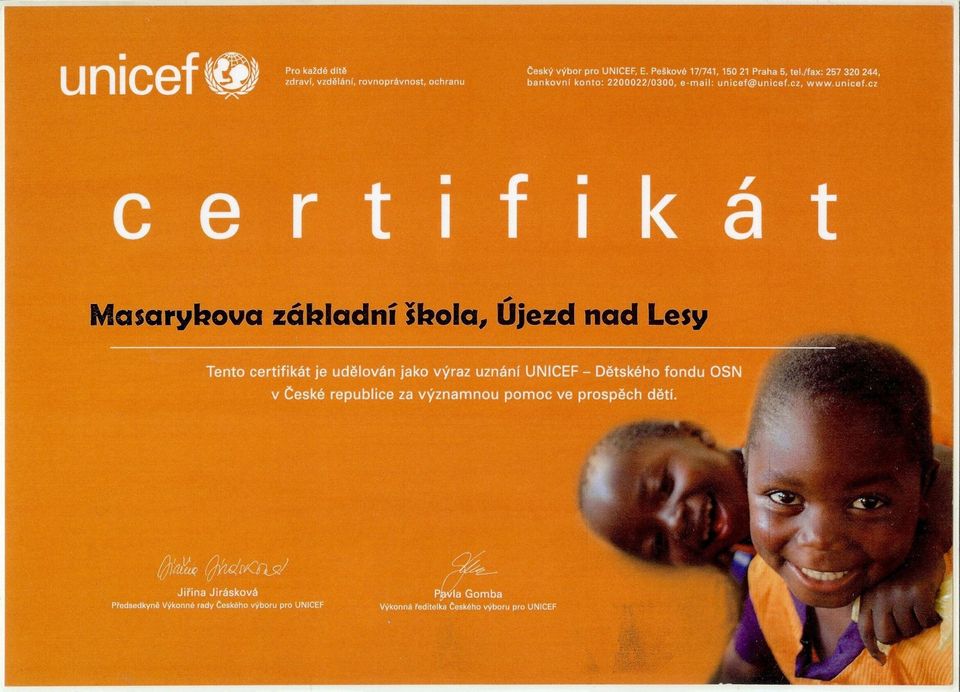 Letošního charitativního jarmarku pro Unicef se osobně zúčastnili hosté - pan starosta RNDr. Pavel Roušar a paní Svobodová, zástupkyně předsedkyně Výkonné rady Českého výboru pro Unicef. Panu řediteli Mgr. Miroslavu Kurkovi předala CERTIFIKÁT, KTERÝ JE UDĚLOVÁN JAKO VÝRAZ UZNÁNÍ UNICEF - DĚTSKÉHO FONDU OSN V ČESKÉ REPUBLICE ZA VÝZNAMNOU POMOC VE PROSPĚCH DĚTÍ.