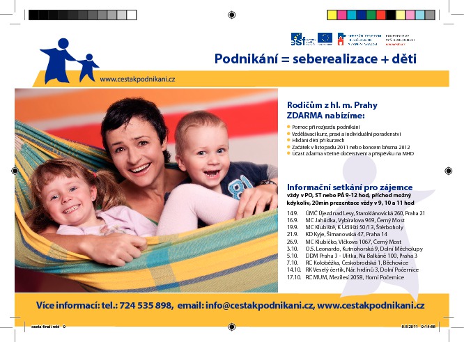 Že právě podnikání by Vám mohlo dát tu pravou svobodu si rozhodovat o časovém rozložení své práce i jejího obsahu? Zapojte se tedy do našeho projektu financovaného z Evropského sociálního fondu a podpořeného Asociací malých a středních podniků a živnostníků ČR., odložte děti do herny a max. dva půldny v týdnu vstřebávejte informace pro svou vlastní budoucnost od zkušených lektorů a podnikatelů. Naučíme Vás, jak vše vyřídit na úřadech, jak získat finance, jak vést účetnictví, jak svůj projekt správně komunikovat, jak jednat s dodavateli, jak si vytvořit webové stránky apod.