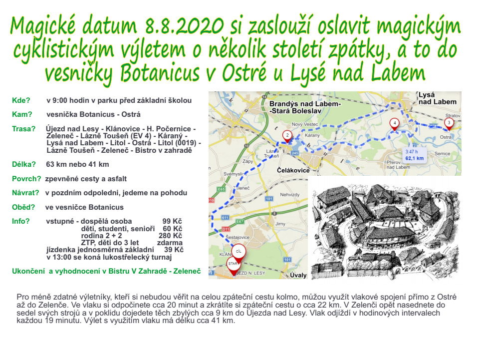 Magické datum 8.8.2020 si zaslouží oslavit magickým cyklistickým výletem o několik století zpátky, a to do vesničky Botanicus v ostré u Lysé nad Labem. Ničeho se nebojte, jsem dva měsíce po operaci kyčle a tak pojedeme opravdu pomalu. A kdyby bylo nejhůře, popojedeme kousek vláčkem.