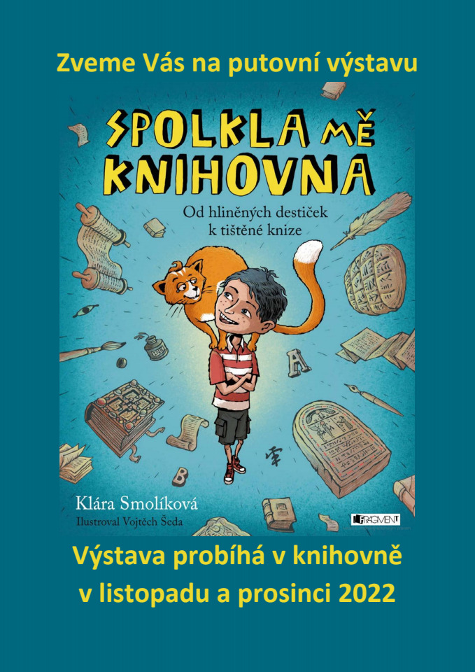 Tím začne dobrodružná výprava do knižní historie! Vypravte se tam s nimi. Navštivte knihovny šlechtické i klášterní, potkejte knihovníky, učence i písaře. Jak to všechno dopadne se přijďte podívat od 1. 11. do 23. 12. 22 do knihovny. Zveme Vás na putovní výstavu knihy spisovatelky Kláry Smolíkové Spolkla mě knihovna s komiksy a ilustracemi Vojtěcha Šedy.