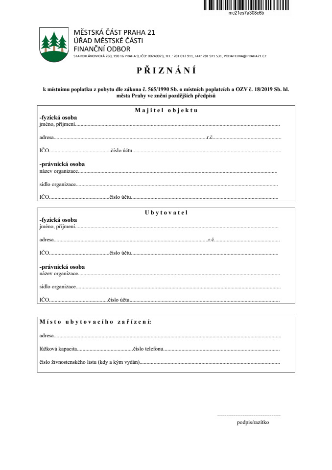 Portál Pražana vám ušetří cestu na úřad. Místní poplatek z pobytu MČ Praha 21 Újezd nad Lesy (někdy se mu říká městská nebo turistická daň) nahrazuje poplatek za lázeňský nebo rekreační pobyt a poplatek z ubytovací kapacity. Ubytovaný platí za každou noc strávenou v ubytovacím zařízení v MČ Praha 21 Újezdě nad Lesypředem stanovenou částku, kterou ubytovací zařízení vybírá přímo a v plné výši ji přeposílá obci. Tyto prostředky slouží k podpoře cestovního ruchu, propagaci města a jeho kulturních akcí.